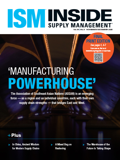 This issue of Inside Supply Management® delves into the future of supply management, with features that focus on the ASEAN region and its supply chain strengths, how Chinese factories are staying resilient amid trade turbulence, and how companies see the need to shift production but not all are reshoring. A fourth feature looks at the six trends shaping the warehouses of the future.